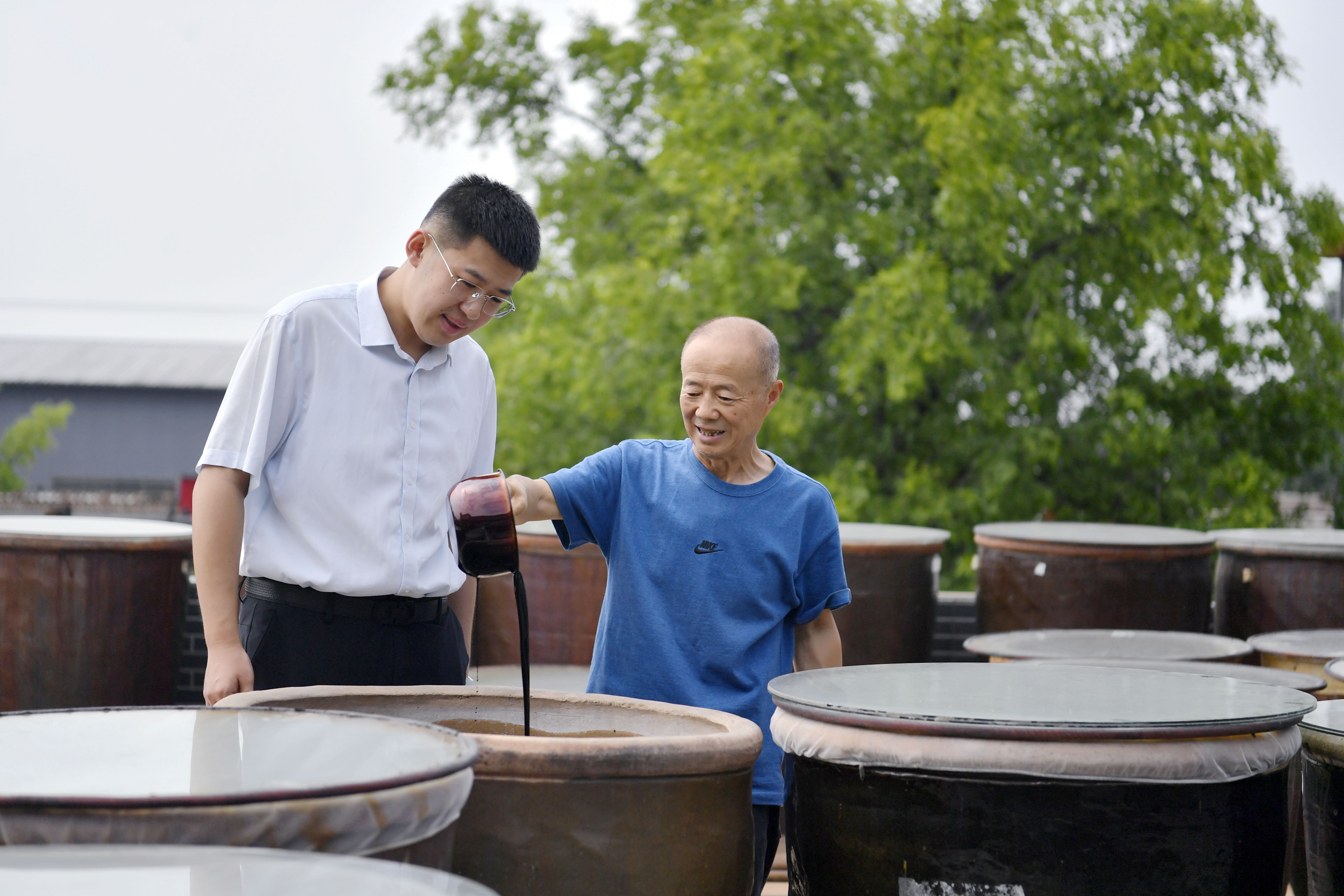 从晋中市区一路西行,未到怀仁村,浓浓的醋香已经随风而至,令人神清气爽。沿着村街直行,榆次非物质文化遗产——怀仁村元庆隆醋坊映入眼帘,走进醋坊车间,一口口棕黑色的大瓷缸并排放着,浓郁醋香扑面而来,沁人心脾,手工酿醋技艺传承人李政正在醋缸前忙碌着,娴熟地翻缸、俯身查看发酵温度……